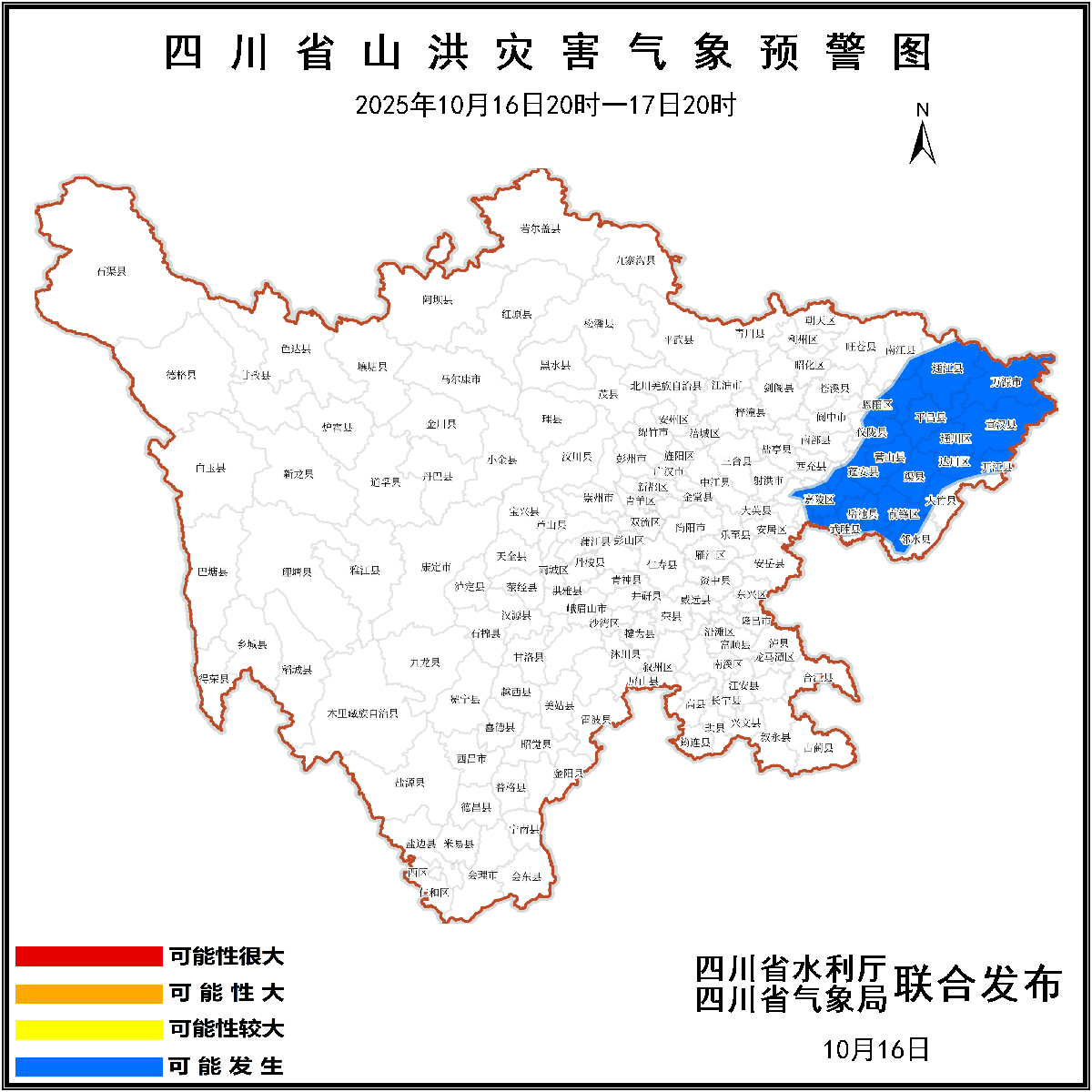 2025年10月16日20时至17日20时,达州市万源、宣汉、通川、渠县、达川、开江、大竹,巴中市平昌、巴州、通江、恩阳、南江,广安市广安、前锋、岳池、武胜、华蓥、邻水,南充市营山、蓬安、顺庆、嘉陵、高坪、仪陇,遂宁市蓬溪等5个市(州)25个县(市、区)可能发生山洪灾害。