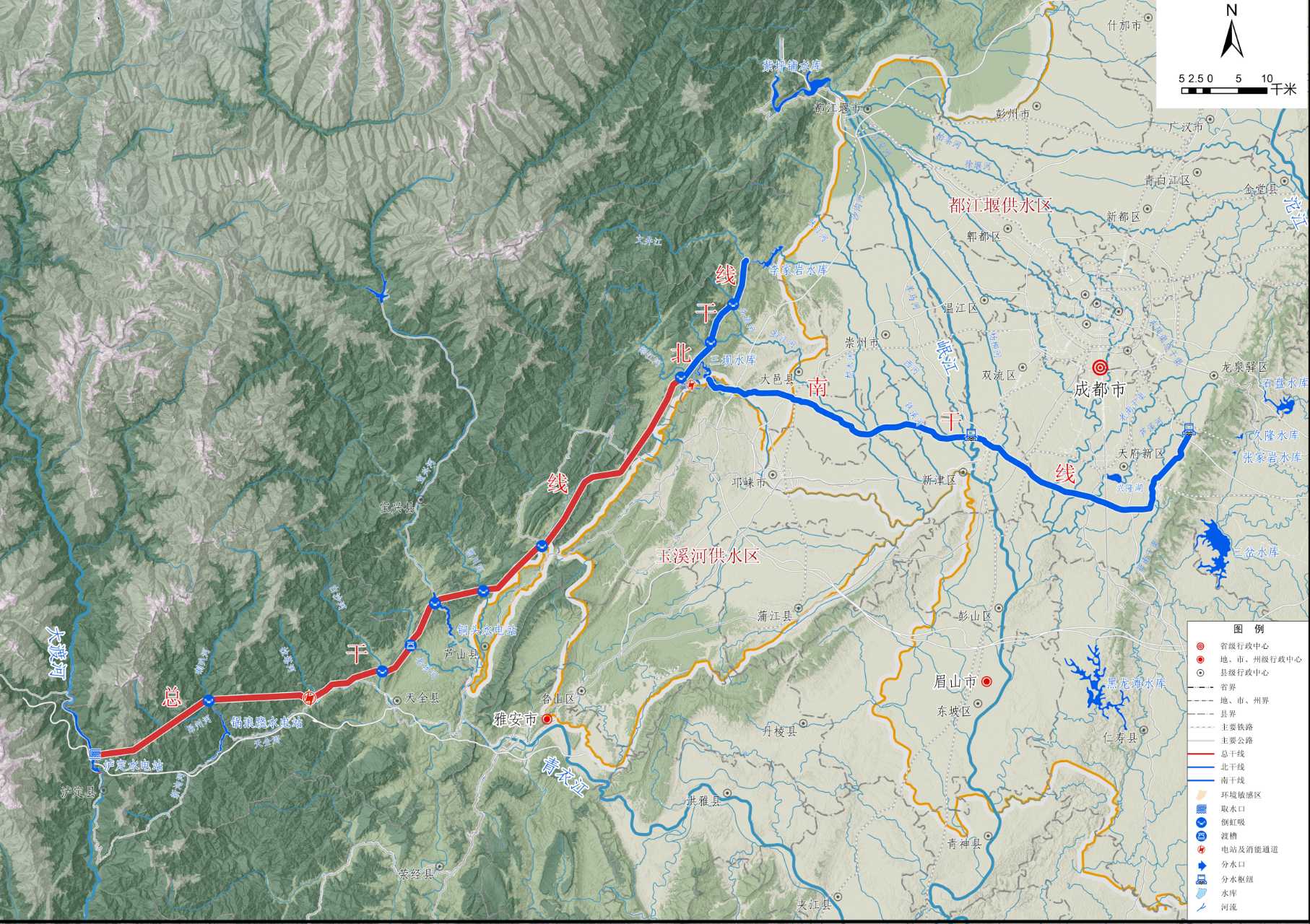 据了解,该工程建设任务以城乡生活和工业供水为主,兼顾农业灌溉。工程供水范围涉及成都、德阳、绵阳、遂宁、内江、眉山、雅安、资阳共8市。设计水平年2040年、2050年,工程多年平均供水量分别为13.89亿立方米、15.23亿立方米。工程由总干线、南干线、北干线组成。总干线从大渡河干流泸定水电站库区引水,至成都三坝水库库尾分南、北干线,输水线路总长261千米。新增灌面179万亩,改善灌面591万亩,供水人口3413万人。工程估算总投资575亿元,总工期96个月。