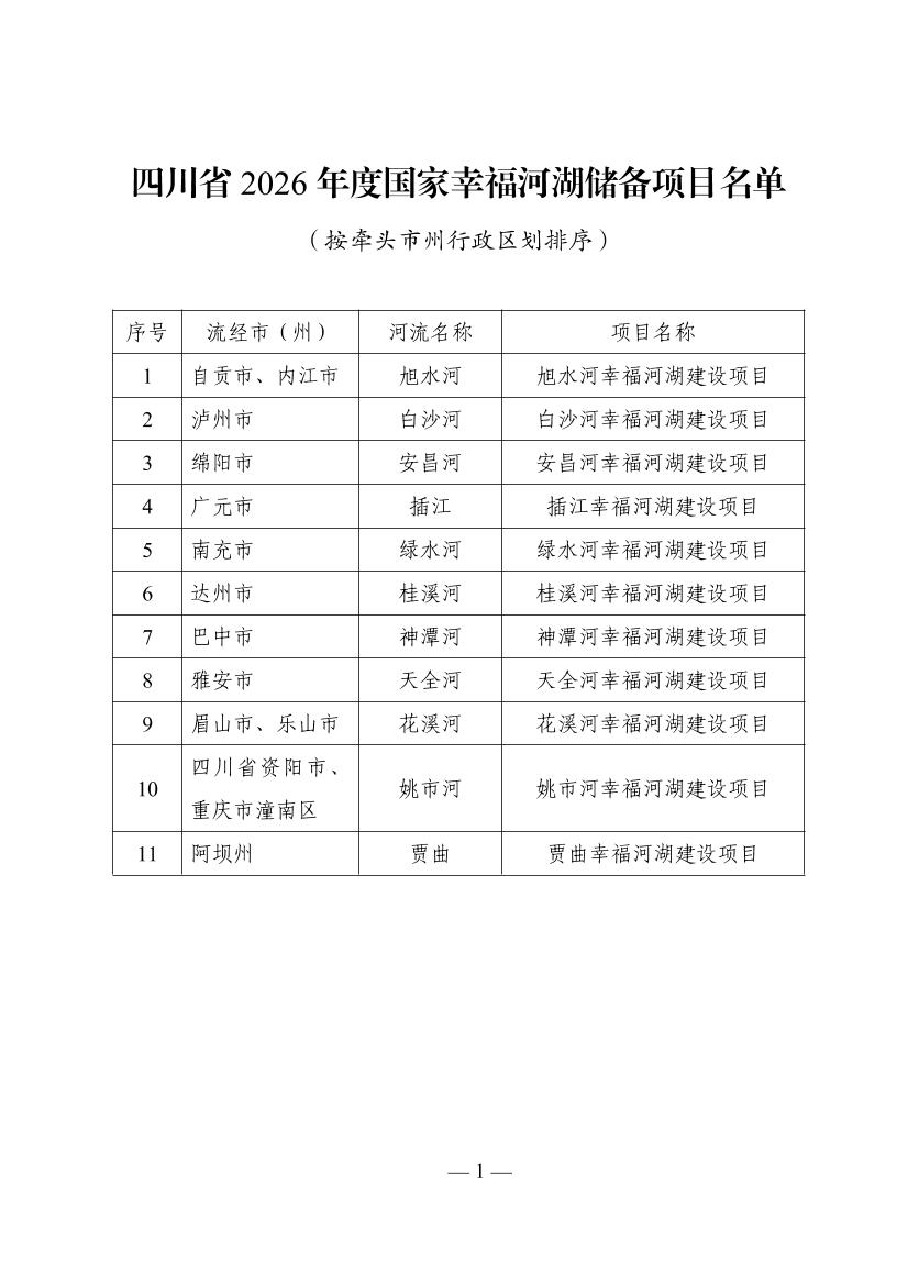 为深入贯彻习近平总书记关于治水的重要论述和关于建设造福人民的幸福河的重要指示精神,全面落实四川省总河长令第6号的决策部署,根据《水利厅关于开展中央财政水利发展资金幸福河湖建设项目储备工作的通知》等文件要求,水利厅会同财政厅组织开展了国家幸福河湖建设项目储备工作。经形式审查、现场评审、实地核查,拟将旭水河等11个幸福河湖建设项目纳入四川省2026年度国家幸福河湖建设项目储备库。现将储备项目名单进行公示(附后),公示期为2026年1月19日至2026年1月23日(共5个工作日)。在公示期内,如有异议,请通过来信、来电等形式反馈水利厅,单位反映情况须加盖公章,个人反映情况应署真实姓名和联系方式。