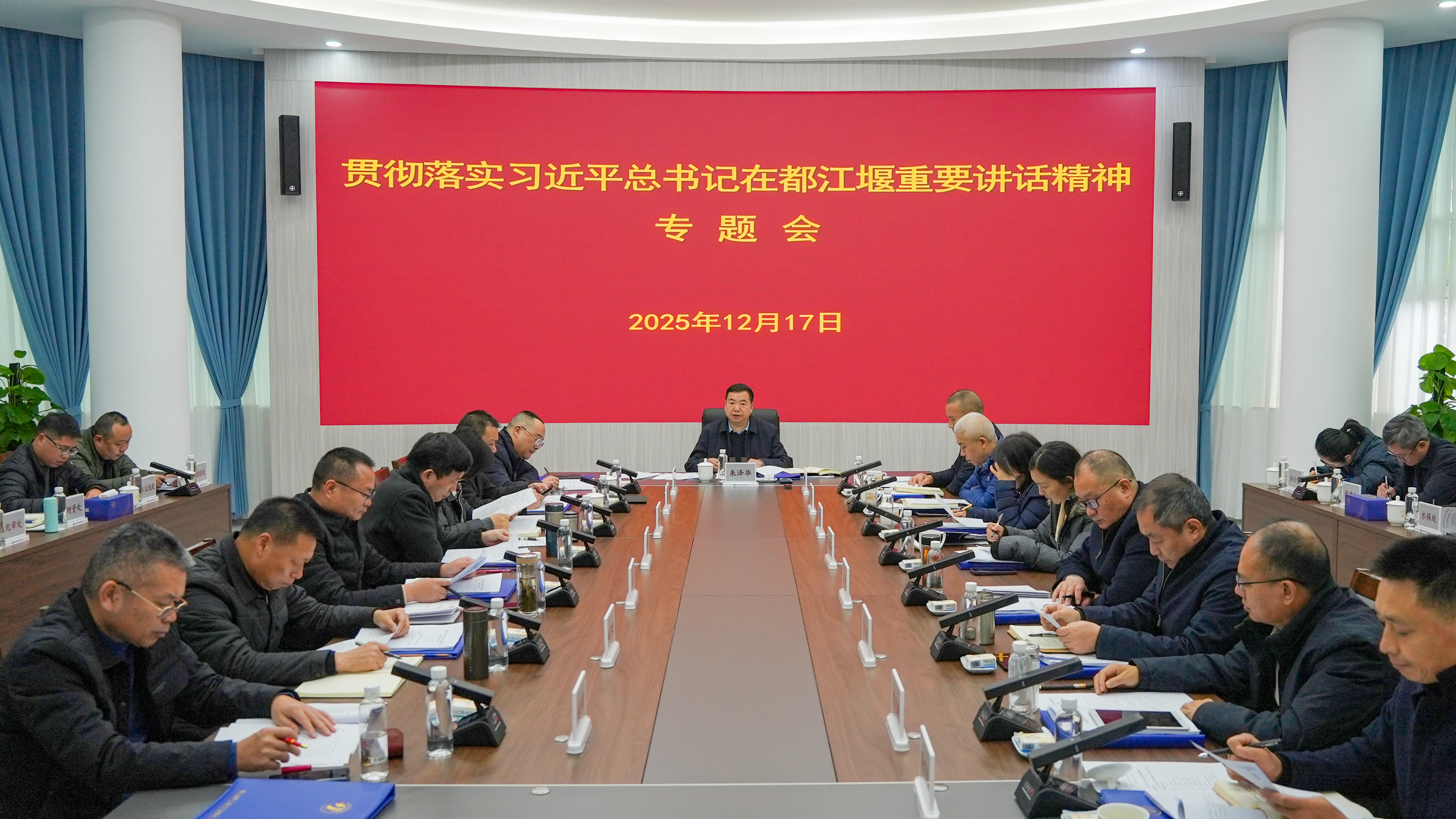 12月17日,省都江堰水利发展中心召开贯彻落实习近平总书记在都江堰重要讲话精神专题会,认真学习贯彻习近平总书记在都江堰重要讲话精神,推动都江堰灌区高质量发展。中心党委书记、主任朱泽华主持会议并讲话。