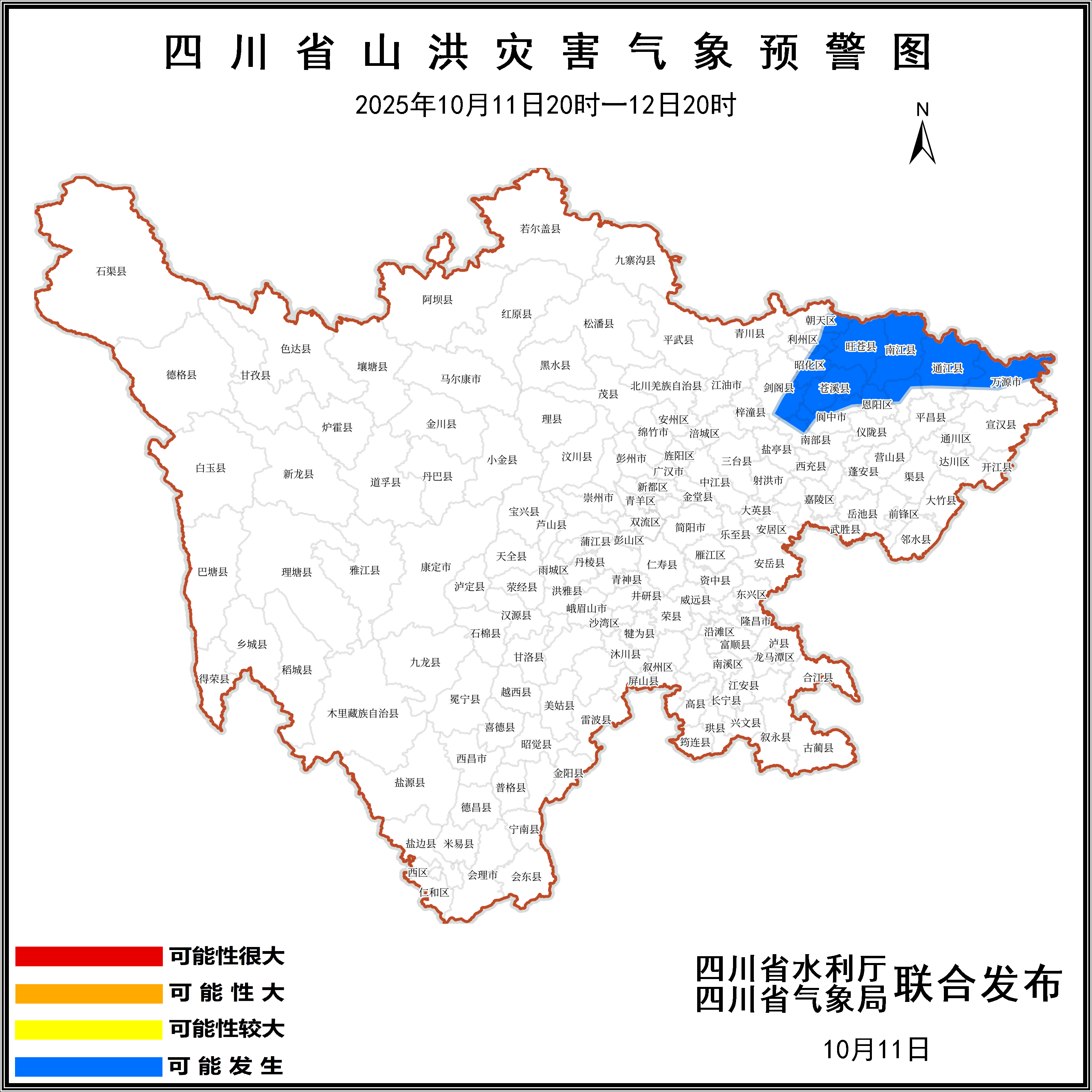 2025年10月11日20时至12日20时,巴中市南江、通江、巴州、恩阳,广元市旺苍、苍溪、昭化、朝天、利州、剑阁,达州市万源,南充市阆中、南部等4个市(州)13个县(市、区)可能发生山洪灾害。