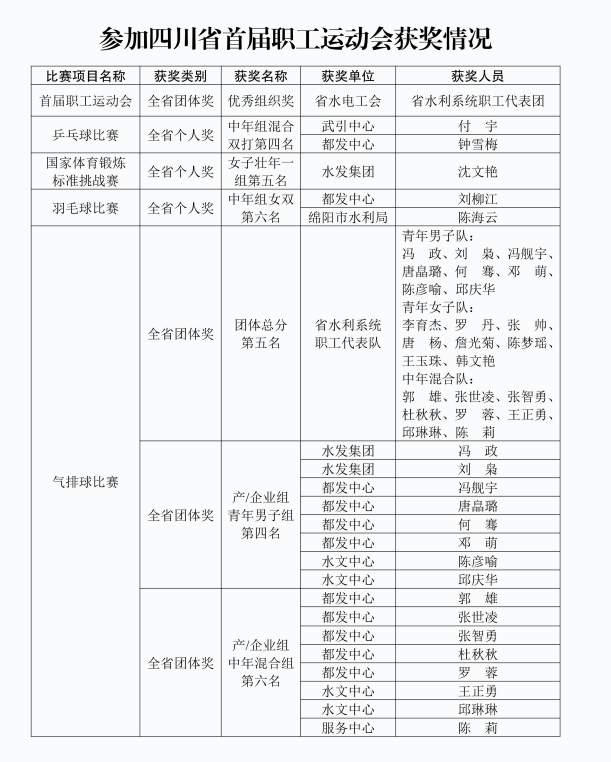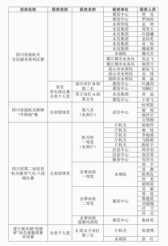 为加快推进体育强国、健康四川建设,激励全厅广大职工积极参与体育锻炼,增强身体素质,丰富精神文化生活,助力推动体育与文旅融合发展,不断开创四川现代化建设新局面,水利系统各单位紧密围绕水利中心工作,广泛组织开展并参加了形式多样、内容丰富的文化体育、技能竞赛活动。2025年,全省水利系统共35个单位、800余人次职工参加了全国、全省的各类文体、技能竞赛活动25项,在17项竞赛活动中获得团体奖项14个,个人奖项28人;水利厅联合人力资源社会保障厅、省总工会组织开展了四川省第八届水利行业职业技能竞赛,设个人奖项30人成功举办首届四川省水利系统职工“水利发展杯”篮球比赛,设团体奖项14个。参赛职工以饱满的精神、顽强的斗志,奋勇拼搏、争创佳绩,充分展现了水利职工昂扬奋进的精神风貌和时代风采。