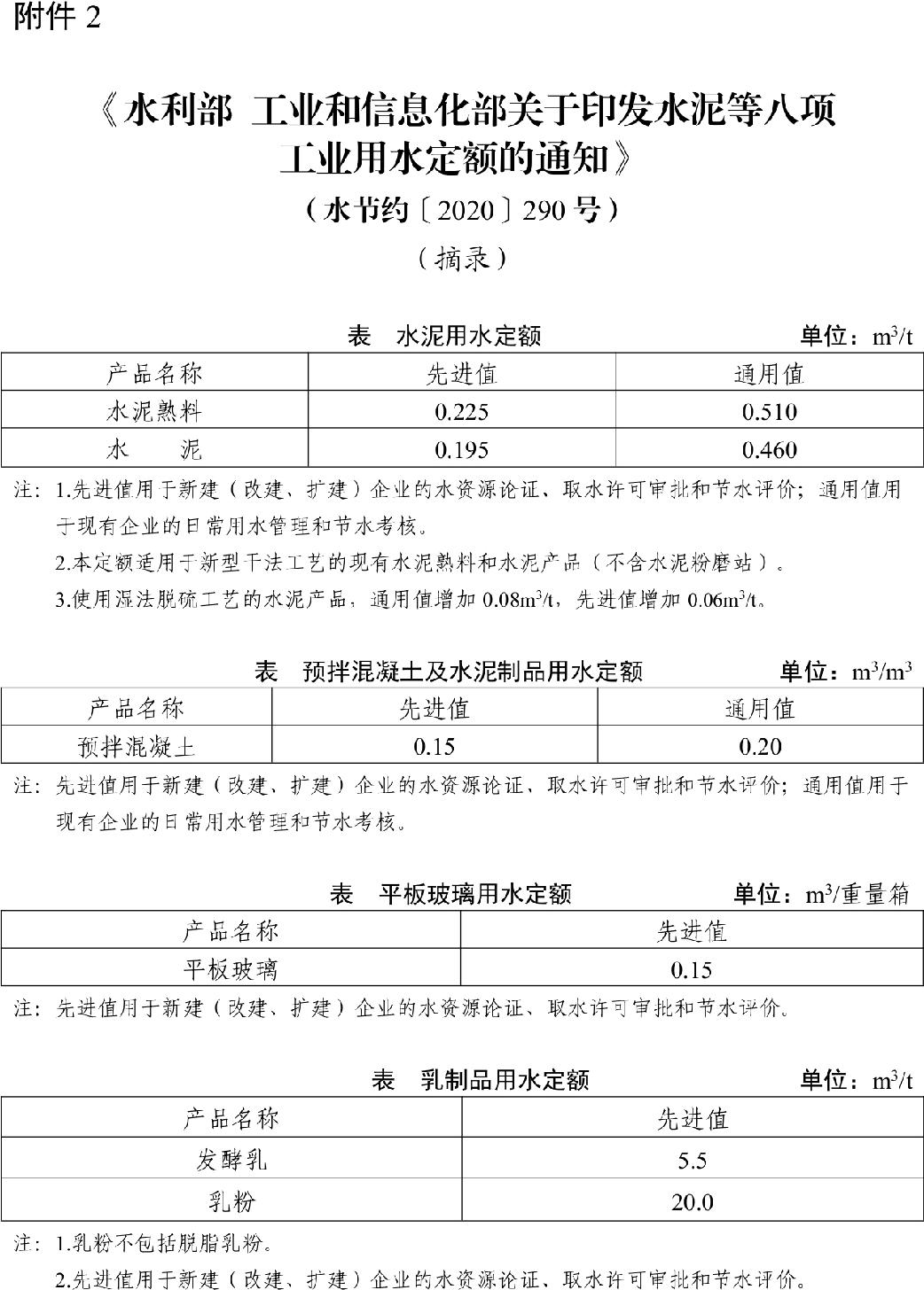 2. 《水利部 工业和信息化部关于印发水泥等八项工业用水定额的通知》(水节约〔2020〕290号)(摘录)