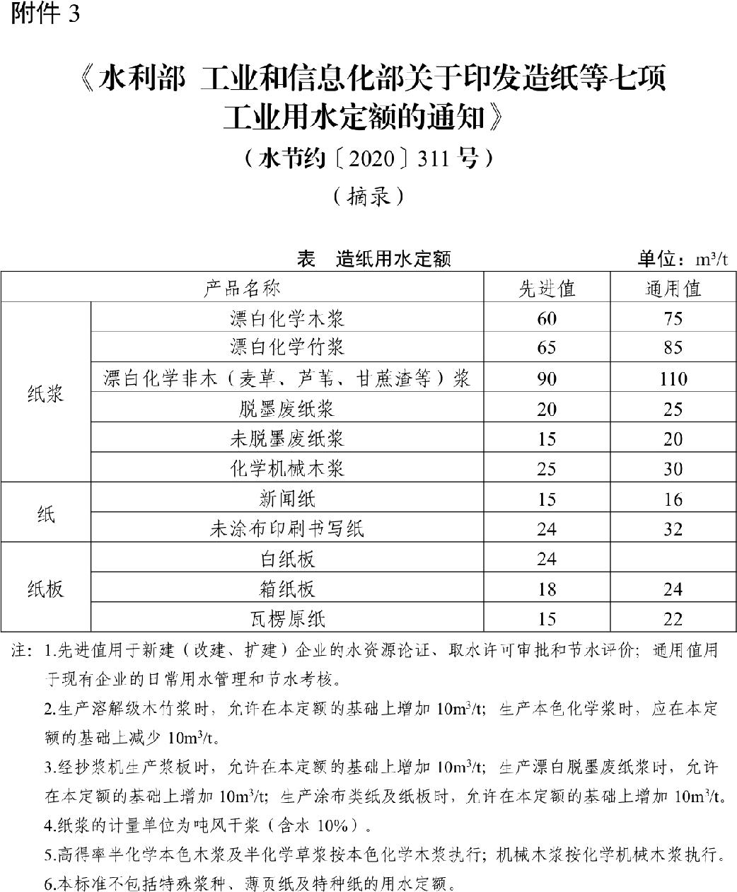 3. 《水利部 工业和信息化部关于印发造纸等七项工业用水定额的通知》(水节约〔2020〕311号)(摘录)