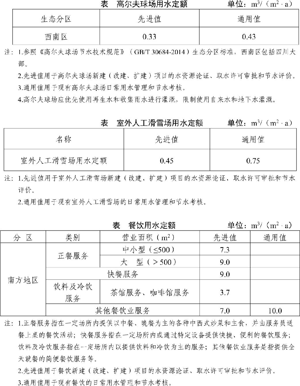 按照《水利部关于加强重点行业用水定额管理的通知》(水节约〔2024〕286号)的要求,为进一步规范用水定额的使用,我厅将《四川省用水定额》(川府函〔2021〕8号,以下简称省定额)与水利部会同有关部委印发的用水定额等(以下简称国家定额)进行了对比,其中有部分国家定额标准优于省定额标准。为全面落实以用水定额标准引领重点行业节约用水,提升水资源节约集约利用水平的要求,现将国家定额的该部分指标摘录印发你们,请在用水定额执行和日常监管中应用。